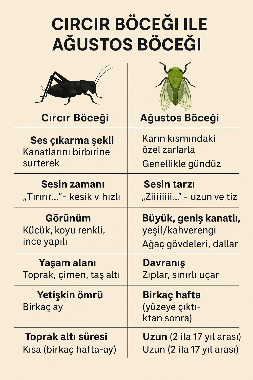 Dün dinlediğim bir podcast e kadar Ağustos böceği ile cırcır böceğini aynı sanıyordum. Meğerse farklıymış. Cırcır böceği yerde, ağustos böceği ağaçta konumlanırmış. Biri gündüz biri gece ötermiş. Bu güzel sesleri ve farkını yazının sonuna bırakıyorum. Keyifle dinleyin!
